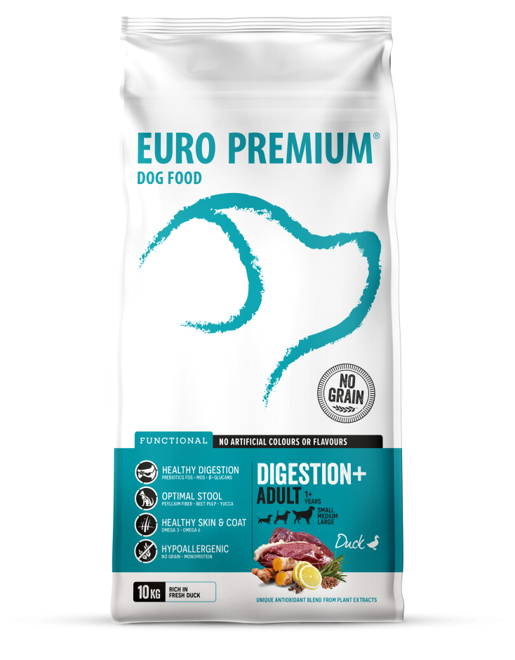 EURO PREMIUM DIGESTION+ rijk aan verse eend is een super-premium hondenvoeding voor een gezonde spijsvertering. Sommige honden reageren gevoelig op bepaalde ingrediënten met spijsverteringsproblemen tot gevolg. Deze hypoallergene receptuur is samengesteld zonder granen en bevat eend als alternatieve, enkelvoudige dierlijke eiwitbron. Het gebruik van verse eend bevordert de opname van dierlijke eiwitten. De prebiotica F.O.S., M.O.S. en ß-glucanen dragen bij tot een gezonde darmflora. Plantaardige vezels zoals bietenpulp en psyllium zorgen voor een betere consistentie van de ontlasting. Yucca schidigera reduceert bovendien een onaangename geur van de ontlasting. De optimale verhouding Omega-3/ Omega-6 vetzuren ondersteunt een gezonde huid en glanzende vacht. Deze voeding bevat een unieke blend van plantenextracten, gekend vanwege hun gunstig effect op de immuniteit. Tenslotte zijn ook gewrichtsondersteunende componenten toegevoegd.
