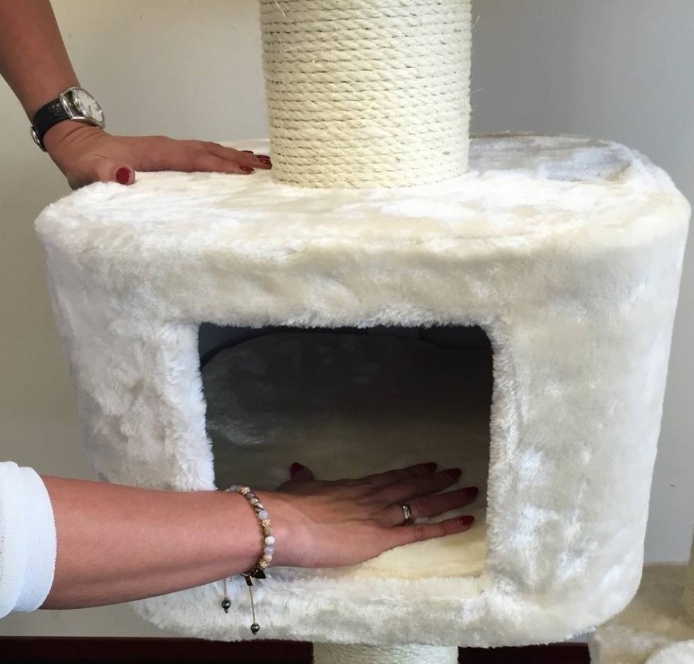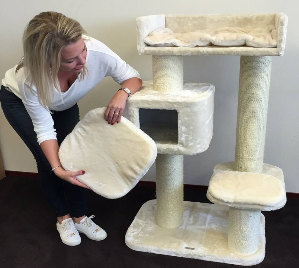 Design Krabpaal Devon Rex Cream voor katten van RHRQuality is een stevige en stijlvolle krabpaal met wel 15cm dikke sisalpalen en een erg grote ligplek bovenop. Met een leuk speelhuis en 2 afneembare kussentjes. Met meerdere sisalpalen van 15 cm dik om lekker aan te krabben met ruim voldoende krablengte ook voor grote katten.