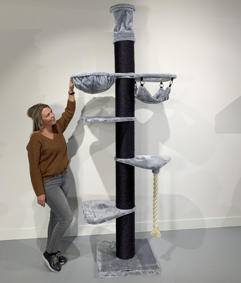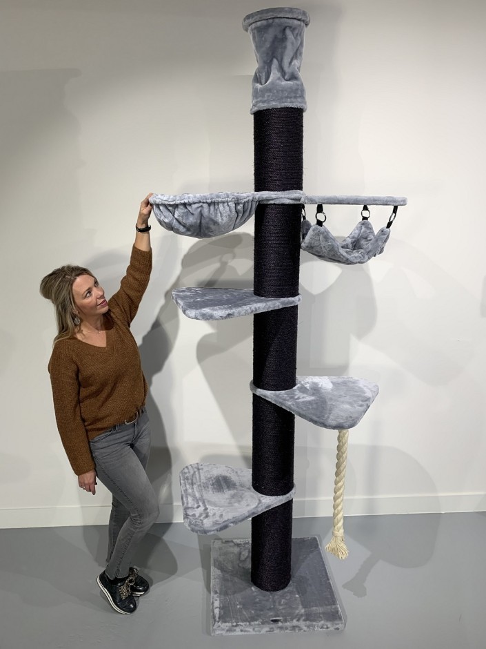 Een plafondhoge krabpaal verstelbaar van 245 tot 265cm (hoger of lager op aanvraag mogelijk). De draaibare hangmat is een unieke combinatie van een hangmat en een kussen. De droom van ieder kat. Deze hangmat is bevestigd met een stevig metalen frame en is getest tot een draagkracht van wel 20kg! De doorgestikte en gewatteerde hangmat is bekleed met extra dikke superzachte pluche.