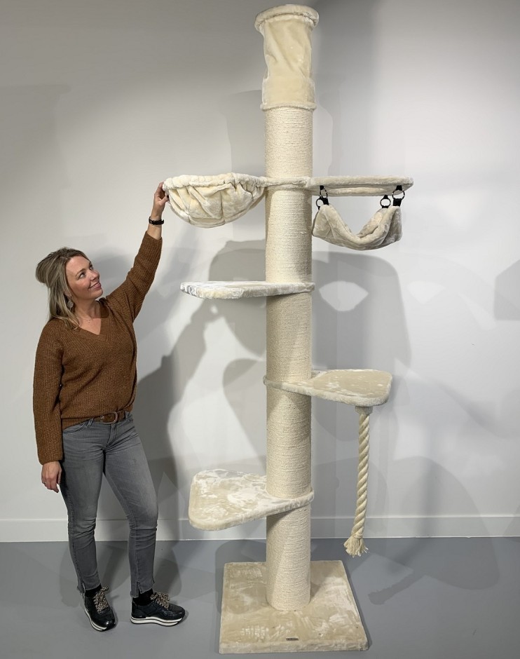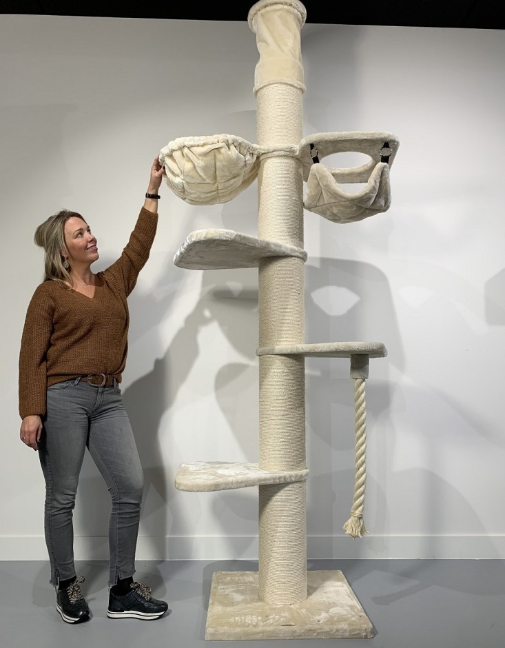 Een plafondhoge krabpaal verstelbaar van 245 tot 265cm (hoger of lager op aanvraag mogelijk). De draaibare hangmat is een unieke combinatie van een hangmat en een kussen. De droom van ieder kat. Deze hangmat is bevestigd met een stevig metalen frame en is getest tot een draagkracht van wel 20kg! De doorgestikte en gewatteerde hangmat is bekleed met extra dikke superzachte pluche.