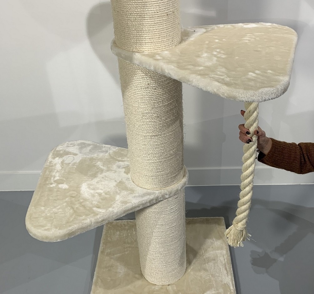 Deze uitdagende plafond krabpaal heeft een variatie aan draaibare hangmatten (45cmØ) en grote (55x55cm) ligplateaus met een stevig extra dik (5cm) speeltouw. U kunt zelf de indeling van de krabpaal bij opbouw bepalen. De krabpaal heeft maar liefst 20cmØ dikke sisalpalen en de onderste sisalpaal zit gemonteerd met 4 schroeven in de bodemplaat voor maximale stabiliteit, waardoor deze zeer stevig en stabiel is dus ook geschikt voor meerdere katten tegelijkertijd.