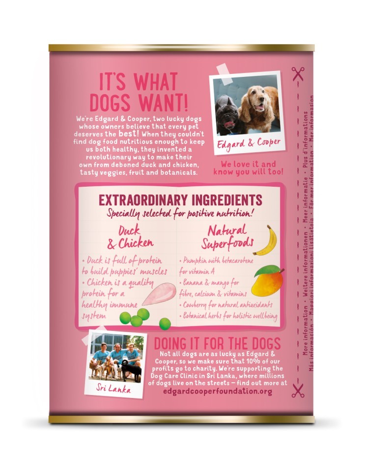 NL Volledig diervoeder voor pups en jonge honden. Samenstelling: eend 30%, kip 26%, mineralen, wortels 2%, broccoli 1%, appels 1%, pompoen 1%, erwten 1%, zalmolie 0,5%, peterselie 0,1%, dille 0,1%. Nutritionele toevoegingsmiddelen per 1 kg: vitamine D3 140 IE. Zink (zinksulfaat-monohydraat) 12 mg; mangaan (mangaan(II)oxide) 1 mg; koper (koper(II)sulfaat-pentahydraat) 0,5 mg; jodium (calciumjodaat, watervrij) 0,3 mg. Analytische bestanddelen: ruw eiwit 9,5%, ruw vet 6%, ruwe celstof 0,3%, ruwe as 2,2%, vochtgehalte 81%. Ten minste houdbaar tot/partijnummer: zie zijkant van de verpakking. Zorg ervoor dat er altijd schoon water klaarstaat. Onze kuipjes worden bij voorkeur koel en droog bewaard. 84 kcal/100 g. GRAANVRIJ