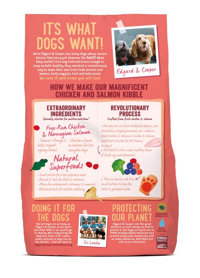 NL Volledig diervoeder voor senior honden 8+. Samenstelling: verse kip 35%, bataten, erwten, verse zalm 5%, lijnzaad, erwteneiwit, kippensaus, mineralen, mannan-oligosachariden (MOS), fructo-oligosachariden (FOS), broccoli 0,04%, bosbessen 0,04%, vossenbessen 0,04%, cranberry's 0,04%, boerenkool 0,04%, maca 0,04%, goudsbloemblaadjes, brandnetel, braambesblaadjes, venkel, karwij, kamille, melisse, glucosamine, chondroïtinesulfaat. Nutritionele toevoegingsmiddelen/kg: vitamine A 20.000 IE, vitamine D3 2.000 IE, vitamine E 350 mg. IJzer (ijzer(II)sulfaat-monohydraat) 75 mg; jodium (kaliumjodide) 3,5 mg; koper (koper(II)sulfaat-pentahydraat) 10 mg; mangaan (mangaan(II)sulfaat-monohydraat) 7,5 mg; zink (zinkoxide) 150 mg; selenium (natriumseleniet) 0,15 mg. Analytische bestanddelen: ruw eiwit 21%, ruw vet 12%, ruwe celstof 5%, ruwe as 7,9%, omega-6-vetzuur 1,2%, omega-3-vetzuur 1,3%, calcium 1%, fosfor 0,8%. Ten minste houdbaar tot/partijnummer: zie bovenzijde van de zak. Uw hond is geen cactus: hij heeft water nodig! Zorg ervoor dat er altijd vers drinkwater voor uw hond beschikbaar is wanneer u hem zijn brokken geeft. Psst... Onze brokken worden bij voorkeur droog en koel bewaard. 349 kcal/100 g. GRAANVRIJ