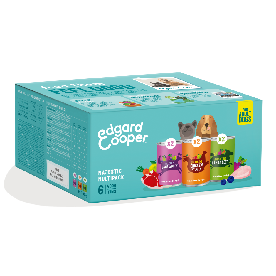 Multipack van 6x 400g blikken Edgard & Cooper natvoeding voor honden.
