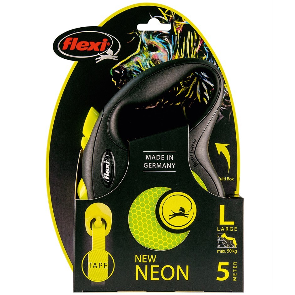 Zichtbare veiligheid. New Neon is de flexi die opvalt. Bij zon door het markante design, in de schemering door haar reflector en altijd positief dankzij haar flexi-kwaliteiten. Geschikt voor honden tot 50 kilo. 5 meter lange rollijn met koord en verchroomde musketon.