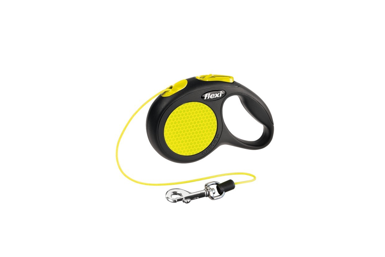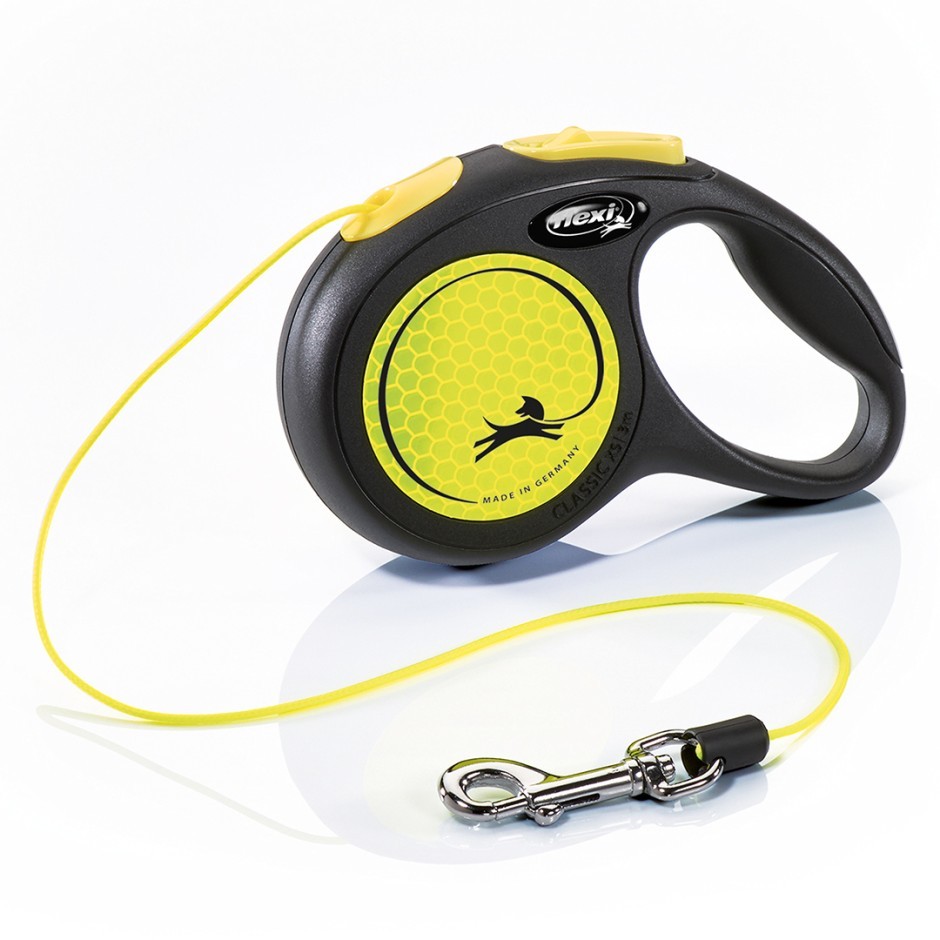 Zichtbare veiligheid. New Neon is de flexi die opvalt. Bij zon door het markante design, in de schemering door haar reflector en altijd positief dankzij haar flexi-kwaliteiten. Geschikt voor honden tot 12 kilo. 3 meter lange rollijn met koord en verchroomde musketon.