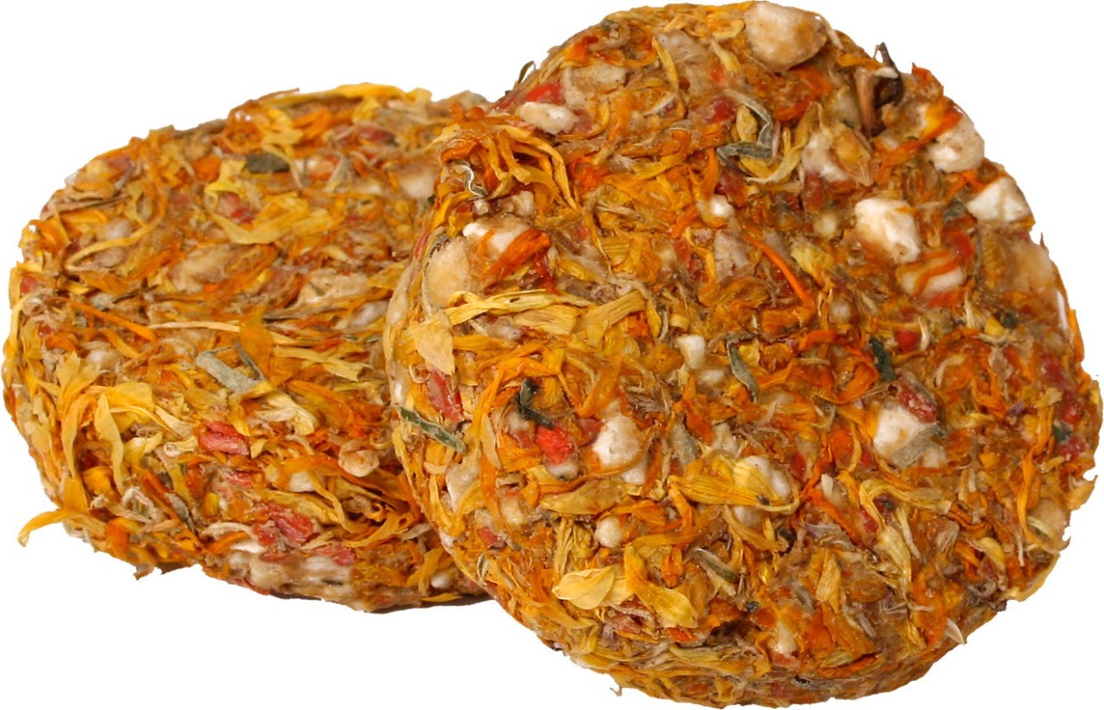 Rond en gezond: Vezelrijke kruiden en bloemen, zonder granen, voor een gezond en allergenenarm dieet. Kan in individuele porties gegeven worden.