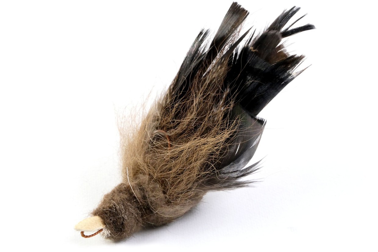 De huismus is gemiddeld 7 cm, plus het verenstaartje en gemaakt van 100% echt buffelwol.