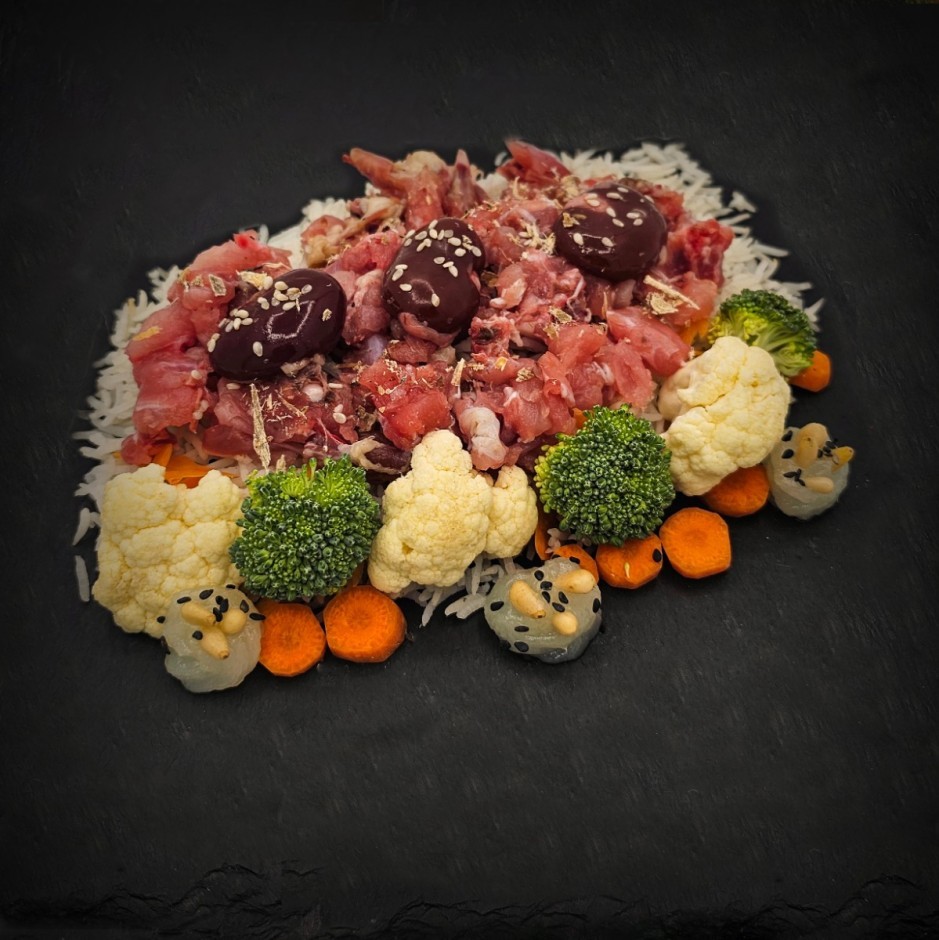 Fijne stukjes karkas van konijn, gebalanceerde groente en