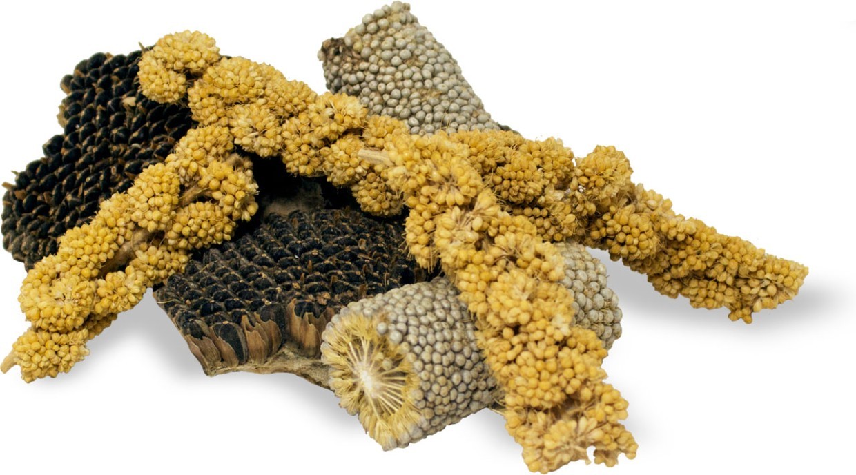 zonnebloem 34%, parelgierst 33%, gele millet 33%