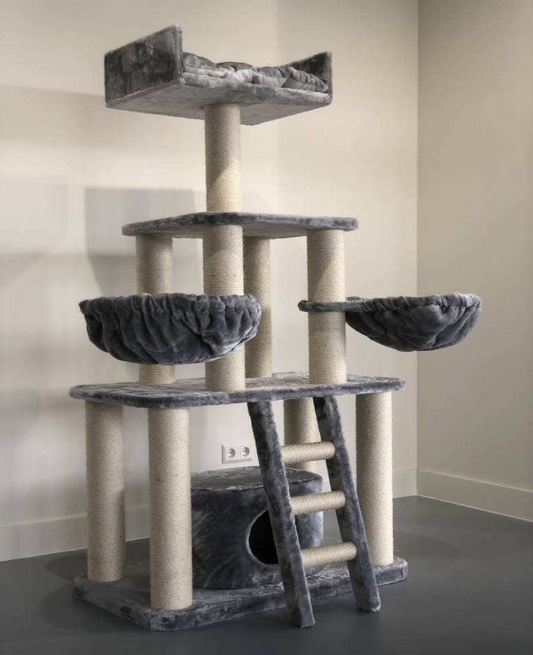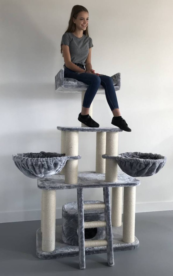 Krabpaal Panther Grijs is een mega stevige krabpaal met een prachtige licht grijze kleur. De Panther Grijs heeft 12 cm dikke sisalpalen en grote 45 cm hangmatten en een mega grote directiezetel van 60 x 43 x 15 cm.