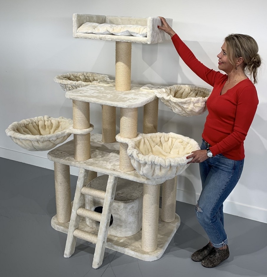 Krabpaal Panther PLUS Cream is een mega stevige krabpaal met een prachtige Cream kleur. De Panther Cream heeft 12 cm dikke sisalpalen en grote 45 cm hangmatten en een mega grote directiezetel van 60 x 43 x 15 cm.
