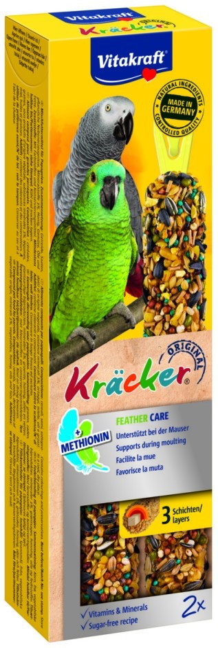 De functionele Vitakraft Kräckers zijn een verantwoorde lekkernij en hebben een echte meerwaarde. Deze functionele Kräcker® ondersteunt de papegaai in de rui en bevatten lekkere zaden en granen op een natuurlijk knabbelhoutje met houten clip. De Kräckers zijn lekker van smaak en 3-voudig gebakken waardoor de ingrediënten stevig vastzitten en de papegaai bezig wordt gehouden zoals dit in de vrije natuur ook gebeurt. Dit zorgt ervoor dat de papegaai zijn snavel op natuurlijke wijze kan afslijten. De Kräckers zijn afgestemd op de voedingsbehoefte van de vogels. De Kräckers bevatten waardevolle vitamines, mineralen en essentiële aminozuren, bereid volgens een suikervrij recept en zijn gemakkelijk in de kooi op te hangen door de cliphouder aan de Kräcker®.