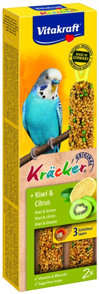 De originele Vitakraft Kräckers zijn een verantwoorde lekkernij en bevatten lekkere granen, zaden, kiwi en citrus op een natuurlijk knabbelhoutje. De Kräckers zijn lekker van smaak en 3-voudig gebakken waardoor de ingrediënten stevig vastzitten en de parkiet bezig wordt gehouden zoals dit in de vrije natuur ook gebeurt. Dit zorgt ervoor dat de snavel van de parkiet op natuurlijke wijze afslijt. De Kräckers zijn afgestemd op de voedingsbehoefte van de vogel. De Kräckers bevatten waardevolle vitamines, zijn bereid volgens een suikervrij recept en zijn gemakkelijk in de kooi op te hangen door de cliphouder aan de Kräcker®.