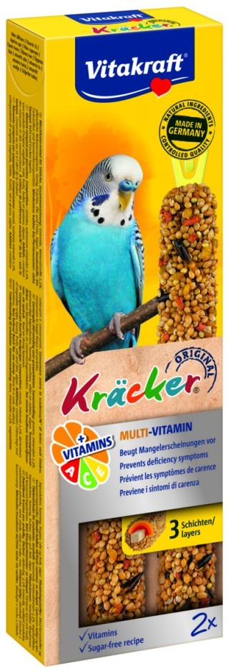 De functionele Vitakraft Kräckers zijn een verantwoorde lekkernij en bevatten lekkere granen op een natuurlijk knabbelhoutje. Deze functionele Kräcker® bevat extra vitamine A, C en E die tekorten voorkomen en het immuunsysteem van de parkiet ondersteunen. De Kräckers zijn lekker van smaak en 3-voudig gebakken waardoor de ingrediënten stevig vastzitten en de parkiet bezig wordt gehouden zoals dit in de vrije natuur ook gebeurt. Dit zorgt ervoor dat de snavel van de parkiet op natuurlijke wijze afslijt. De Kräckers zijn afgestemd op de voedingsbehoefte van de vogel. De Kräckers bevatten waardevolle vitamines, zijn bereid volgens een suikervrij recept en zijn gemakkelijk in de kooi op te hangen door de cliphouder aan de Kräcker®.