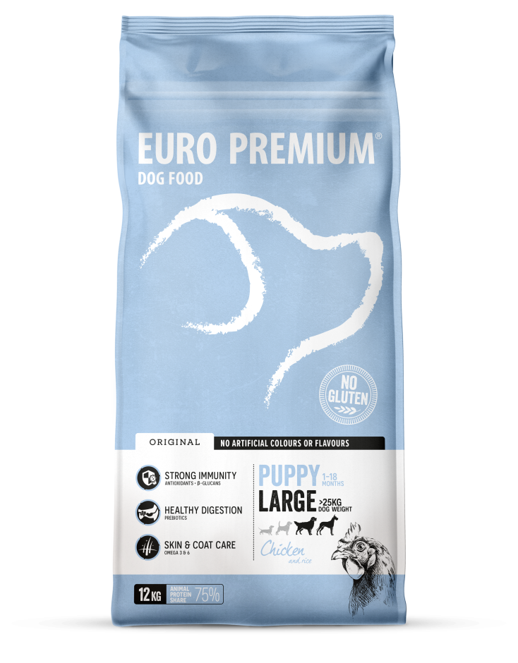 EURO PREMIUM Puppy Large - Chicken & Rice is een volledige, super-premium voeding voor opgroeiende honden van grote rassen (1-18 maanden en vanaf 25kg volwassen gewicht). Een optimale weerstand en een gezonde spijsvertering worden ondersteund door de toevoeging van een unieke blend van plantenextracten - rijk aan antioxidanten - aangevuld met prebiotica en ß-glucanen. Een optimale verhouding Omega-3 / Omega-6 vetzuren bevordert een gezonde huid en glanzende vacht. Kip, de belangrijkste bron van dierlijke eiwitten, draagt samen met de mineralen bij tot de ontwikkeling van sterke tanden, botten en spieren. Hoogwaardige visolie, rijk aan DHA en EPA, ondersteunt het leervermogen. Gewrichts-ondersteunende componenten dragen bij tot gezonde gewrichten. Samengesteld met rijst in plaats van glutenbevattende granen om tegemoet te komen aan honden met een glutenintolerantie.
