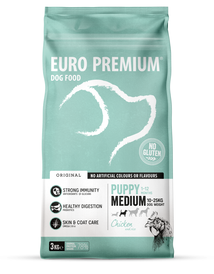 EURO PREMIUM Puppy Medium - Chicken & Rice is een volledige, super-premium voeding voor opgroeiende honden van middelgrote rassen (1-12 maanden en 10 - 25kg volwassen gewicht). Deze energierijke voeding voor een optimale groei is tevens aanbevolen voor drachtige en zogende honden. Een optimale weerstand en een gezonde spijsvertering worden ondersteund door de toevoeging van een unieke blend van plantenextracten - rijk aan antioxidanten - aangevuld met prebiotica en ß-glucanen. Een optimale verhouding Omega-3 / Omega-6 vetzuren bevordert een gezonde huid en glanzende vacht. Kip, de belangrijkste bron van dierlijke eiwitten, draagt samen met de mineralen bij tot de ontwikkeling van sterke tanden, botten en spieren. Hoogwaardige visolie, rijk aan DHA en EPA, ondersteunt het leervermogen. Samengesteld met rijst in plaats van glutenbevattende granen om tegemoet te komen aan honden met een glutenintolerantie.