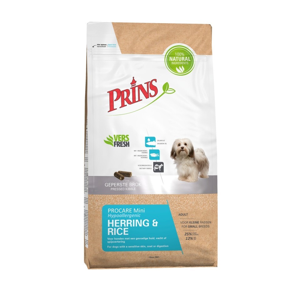 Prins ProCare Herring & Rice Mini is een volledige geperste voeding voor volwassen honden van kleine rassen. De voeding bevat alleen haring als dierlijke eiwitbron en is daarmee ideaal voor dieren die gevoelig reageren op andere dierlijke eiwitbronnen. Het ondersteunt hierdoor de huid, vacht en spijsvertering en is verrijkt met zalmolie, wat rijk is aan omega-3 vetzuren. Voedingsvezels zorgen voor een evenwichtige darmflora.