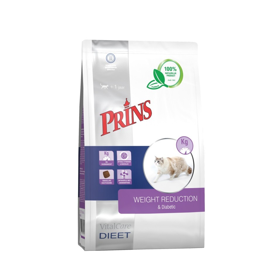Deze dieetvoeding kan droog gegeven worden. Bereiding is niet nodig. Zorg dat er altijd vers drinkwater op kamertemperatuur ter beschikking staat. Verdeel de dagportie VitalCare dieet Weight Reduction & Diabetic over meerdere kleine maaltijden per dag. Wilt u uw kat eens extra verwennen, biedt het dan een schijfje TotalCare Indoor Complete aan. Dè gezonde en natuurlijke versvleesmaaltijd voor uw kat. Overige bijvoeding wordt afgeraden. Aanvullende informatie dieetvoeding. Bijzonder voedingsdoel is het verminderen van overgewicht en/of regulering van de glucosevoorziening (Diabetes mellitus). Essentiële voedingskenmerken: laag energiegehalte en laag gehalte aan snel glucoseafgevende koolhydraten. Aanbevolen gebruiksduur: totdat het gewenste lichaamsgewicht is bereikt of aanvankelijk ten hoogte 6 maanden. Aangeraden wordt om vóór gebruik of voor verlenging van de gebruiksduur een dierenarts te raadplegen. Contra-indicaties: kittens, drachtige of zogende poezen. VitalCare dieet Weight Reduction & Diabetic is bijzonder geschikt voor volwassen katten met overgewicht en/of Diabetes mellitus (suikerziekte). Meng gedurende minimaal 7 dagen steeds meer nieuwe voeding door de oude voeding tot u geheel bent overgestapt. Na het behalen van het gewenste gewicht kunt u overstappen naar Prins VitalCare Indoor.