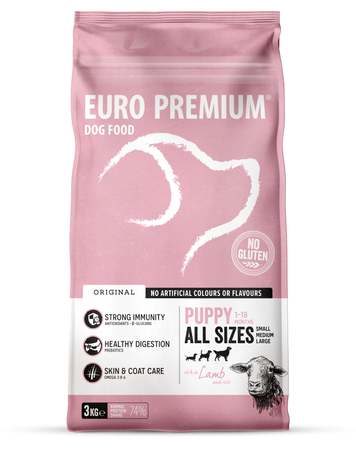 EURO PREMIUM Puppy All Sizes - rich in Lamb & Rice is een volledige, super-premium voeding voor opgroeiende honden met een voorkeur voor lam (Small/Medium 1-12 maanden en Large 1-18 maanden). Een optimale weerstand en een gezonde spijsvertering worden ondersteund door de toevoeging van een unieke blend van plantenextracten - rijk aan antioxidanten - aangevuld met prebiotica en ß-glucanen. Een optimale verhouding Omega-3 / Omega-6 vetzuren bevordert een gezonde huid en glanzende vacht. Lam, een belangrijke bron van dierlijke eiwitten, draagt samen met de mineralen bij tot de ontwikkeling van sterke tanden, botten en spieren. Hoogwaardige visolie, rijk aan DHA en EPA, ondersteunt het leervermogen. Gewrichts-ondersteunende componenten dragen bij tot gezonde gewrichten. Samengesteld met rijst in plaats van glutenbevattende granen om tegemoet te komen aan honden met een glutenintolerantie.
