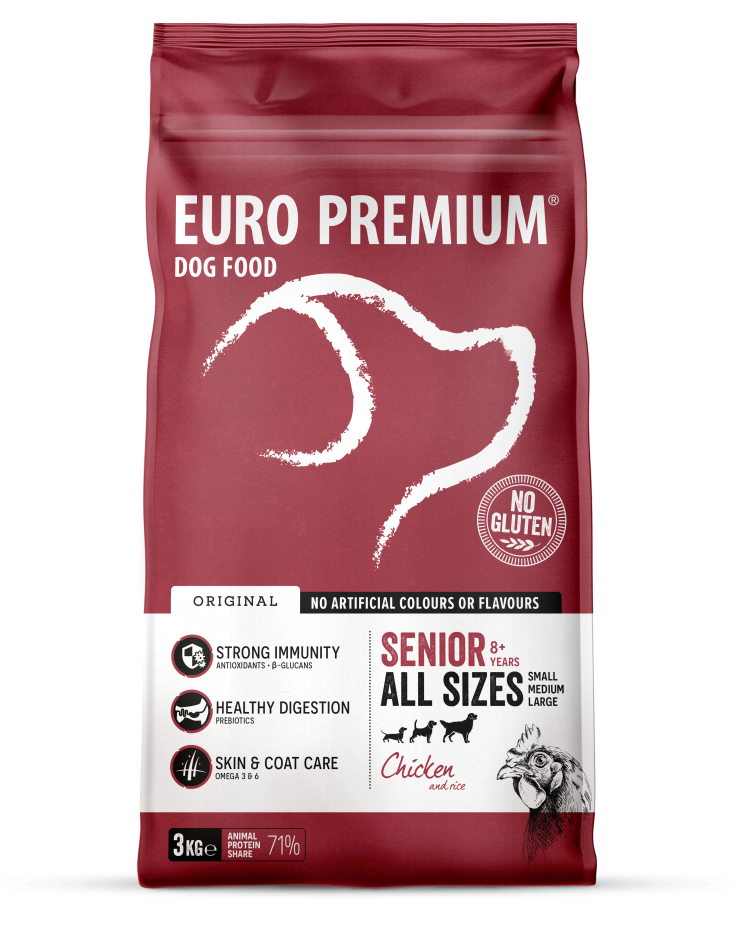 EURO PREMIUM Senior – Chicken & Rice is een volledige, super-premium voeding voor volwassen honden (vanaf 8 jaar ). Deze voeding ondersteunt het vitaal ouder worden van uw senior hond. Het brokje heeft een gaatje zodat het makkelijker kan breken tijdens het kauwen. Een goed geheugen en een goede mobiliteit worden ondersteund door de Omega-3 vetzuren DHA en EPA. Ook zijn gewrichts-ondersteunende componenten toegevoegd. De voeding bevat een unieke blend van plantenextracten - rijk aan antioxidanten – gekend vanwege hun gunstig effect op de immuniteit, samen met vitamine C en E. Prebiotica en ß-glucanen dragen bij tot een gezonde darmflora. Een optimale verhouding Omega-3 / Omega-6 vetzuren bevordert een gezonde huid en glanzende vacht. Samengesteld met rijst in plaats van glutenbevattende granen om tegemoet te komen aan honden met een glutenintolerantie.
