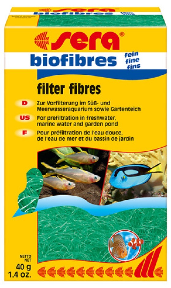 Sera biofibres voor de biomechanische voorfiltering houden grove deeltjes effectief tegen. Zo beschermen ze de volgende filtermedia tegen ernstige vervuiling en verhogen daarmee de biologische effectiviteit van het filter. Sera biofibres dienen bovendien uitstekend als kuitsubstraat en als schuilplaats voor jonge vissen. Voor filters in zoet-, zee- en vijverwater.