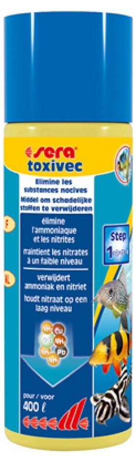 Door destabiliserende factoren (o.a. overvoedering, een hoge bezettingsgraad, een nieuwe inrichting, uitgebreide reingingsmaatregelen of het gebruik van geneesmiddelen), kunnen er in het aquariumwater plotseling massale belastingspieken met vistoxisch schadelijke stoffen als ammoniak, nitriet ontstaan. Sera toxivec verwijdert in zulke noodsituaties deze giftige stoffen direct, evenals andere gevaarlijke substanties als chloor en zware metalen. Het natuurlijk evenwicht komt snel weer tot stand door het verwijderen van de belastende stoffen en wel zonder dat herhaald stress veroorzakend op grote schaal water verversen nodig is.