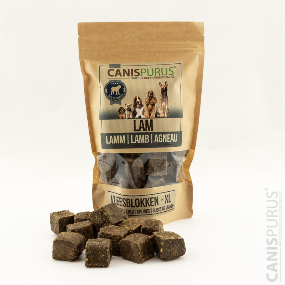 De gedroogde vleesblokken zijn in kubusvorm ongeveer 3 x 3 x 3 cm.