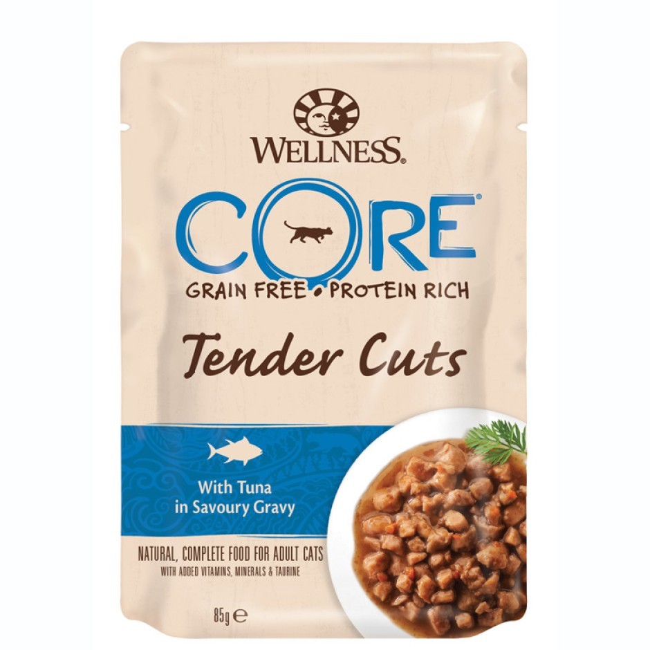 Wellness CORE Tender Cuts Natuurlijke Graanvrije natte kattenvoeding zijn gezonde, complete en uitgebalanceerde recepten voor volwassen katten om te genieten van heerlijke hapjes van gevogelte of vis geserveerd in een hartige saus. Met smaak voorop maar gezondheid als kern van onze voeding bereiden we malse stukjes kip of zalm die we combineren met gezonde groenten en fruit zoals wortelen, witte zoete aardappelen, veenbessen en bosbessen. Net als alle Wellness CORE recepten, zijn Tender Cuts vrij van granen, tarwe, maïs, soja, zuivelproducten, kunstmatige kleurstoffen, smaakstoffen of conserveringsmiddelen. Wellness Core Tender Cuts zijn een gezonde en natuurlijke voeding die zelfs de meest kieskeurige eters zullen behagen. Met de eenvoudig te openen single serve verpakking kunt u uw kat elke dag weer verwennen.